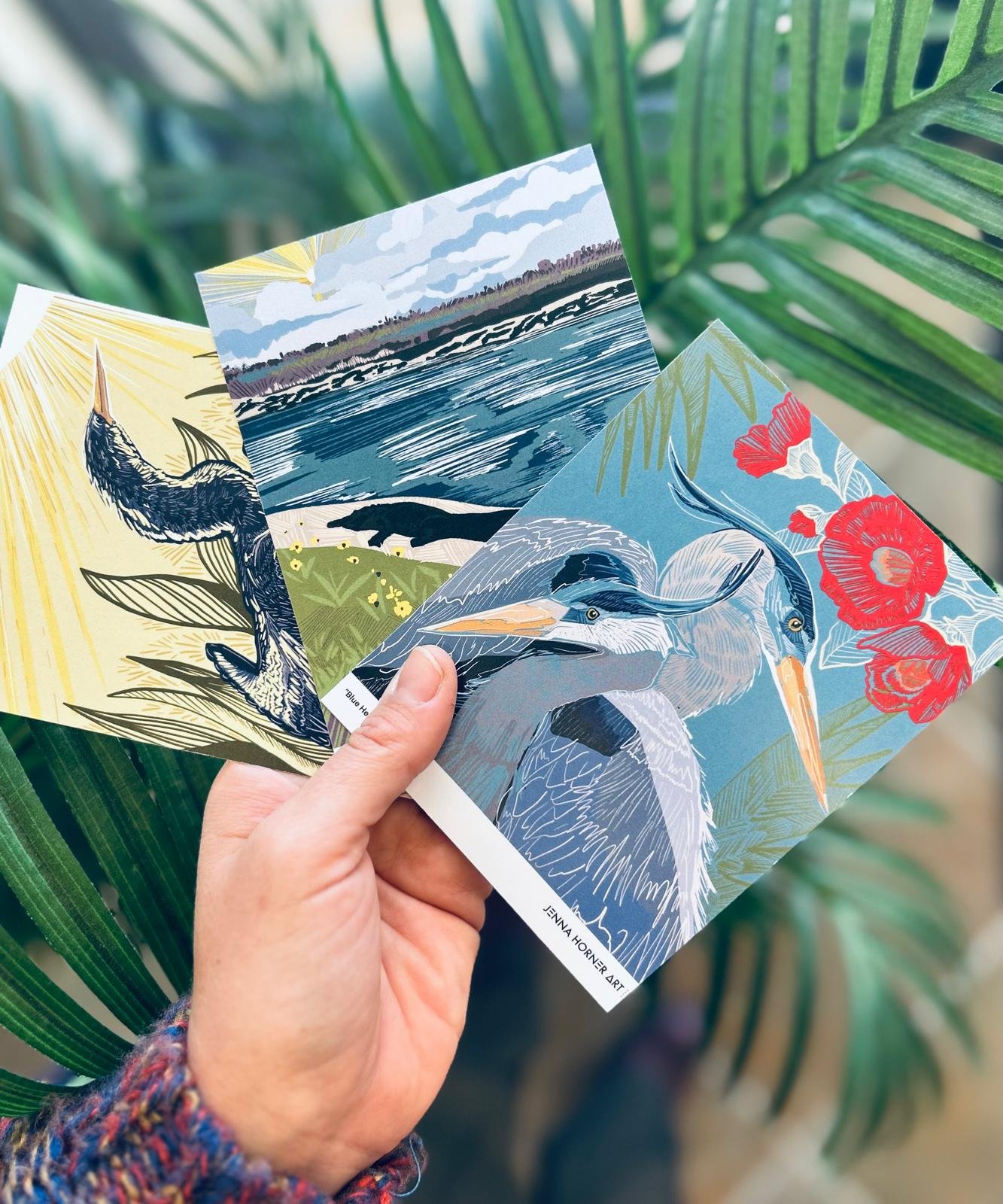 Sweetwater Wetlands Series: Features two postcards of each of the three prints from the Sweetwater Wetlands Series, featuring stunning depictions of Florida’s unique wildlife and landscapes, such as herons, alligators, and lush wetland scenes.